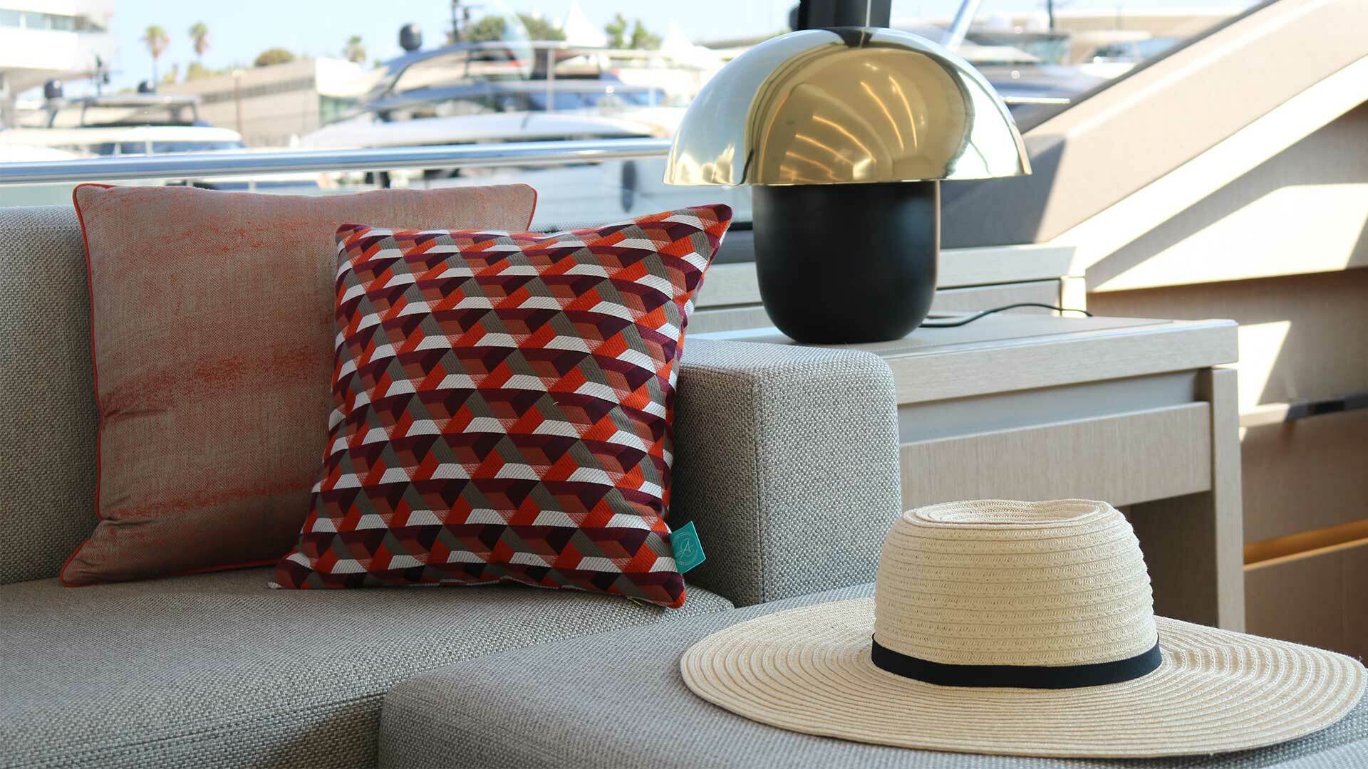 Für jede Yacht von PRESTIGE hat Atelier Créativa Kompositionen von dekorativen Kissen für den Innen- und Außenbereich geschaffen. Agnieszka Clavier, Designerin der Marke, steht somit mit ihrer ganzen Expertise den Eignern zur Verfügung. Im Mittelpunkt stehen „Made in France“ und ein Sortiment von Premiumprodukten in bester Verarbeitung.