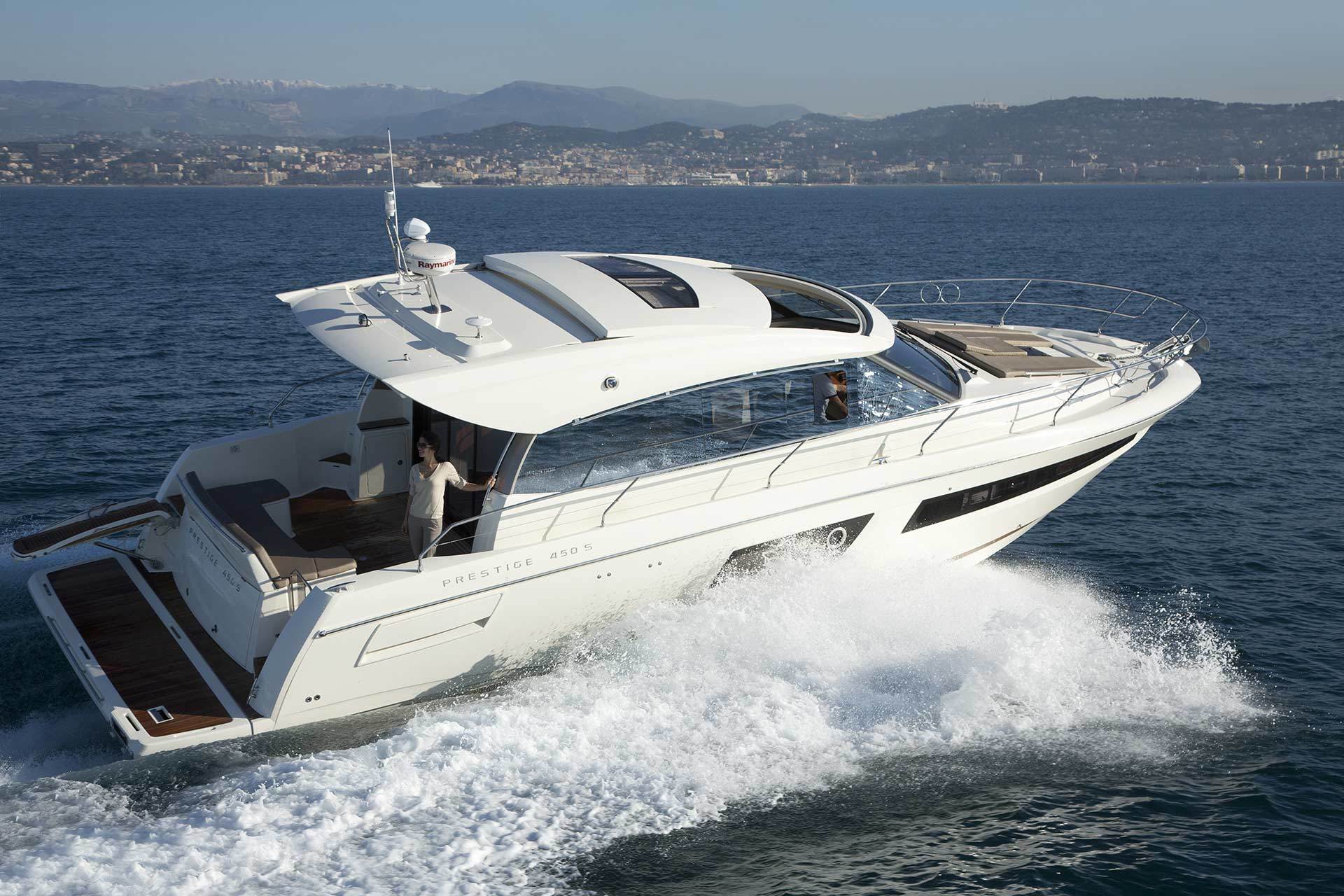 PRESTIGE ha revisado el concepto de los «coupé » del PRESTIGE 500: El PRESTIGE 450S diseñado en torno a una propulsión IPS, ofrece un acogedor y luminoso salón, bien aireado por su gran techo corredizo y el gran ventanal trasero deslizante. Un auténtico espacio bañado por la luz del sol y rodeado por el mar…
